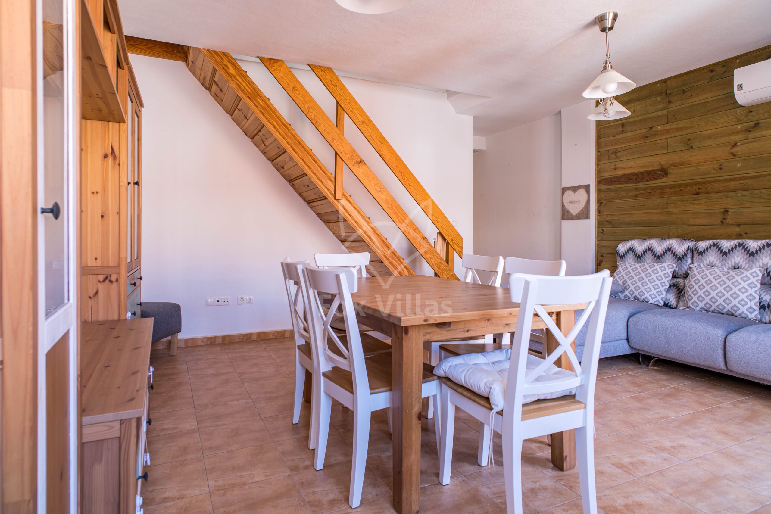 - Lichte woonkamer met airco en afvoer voor pelletkachel