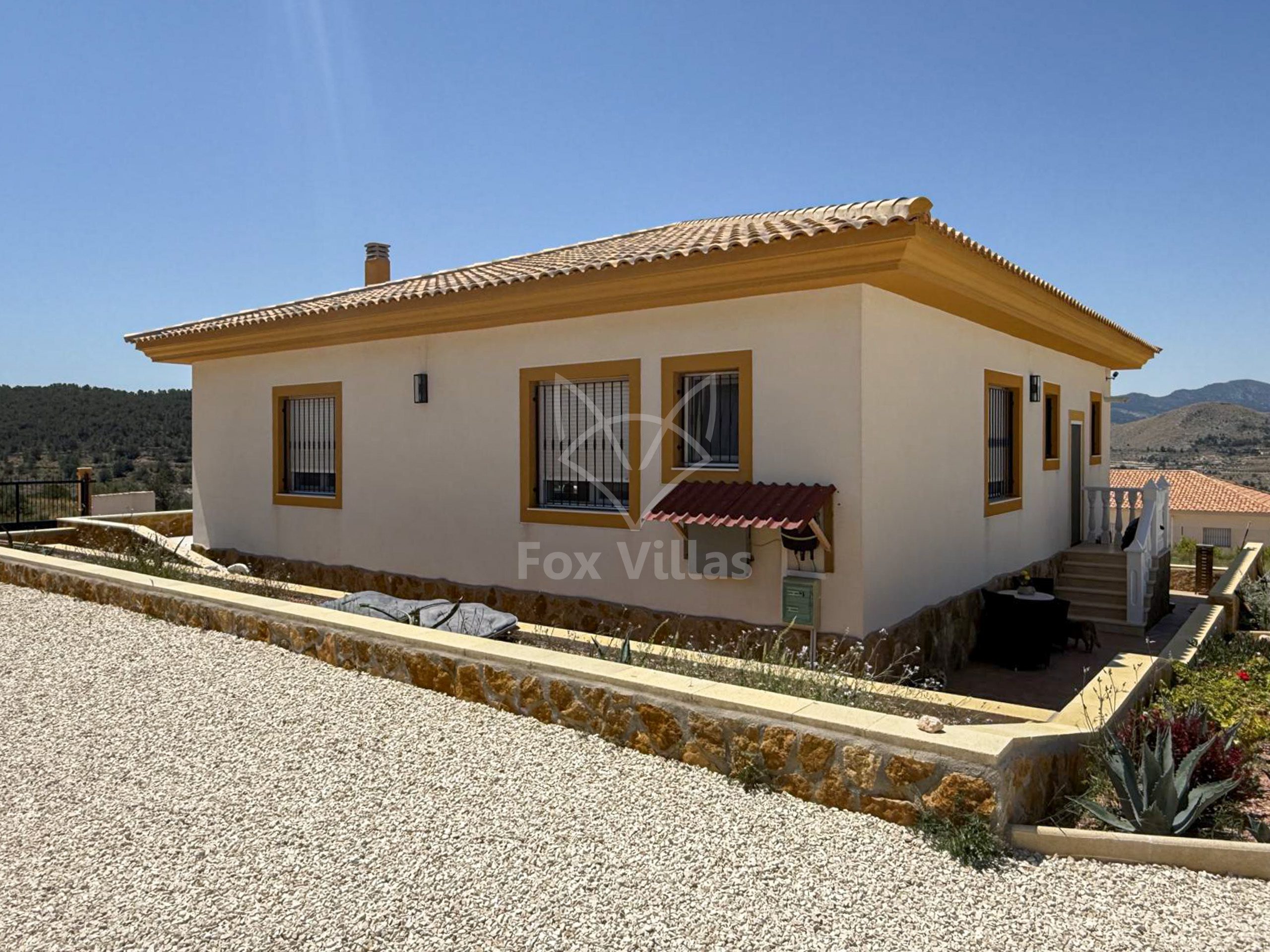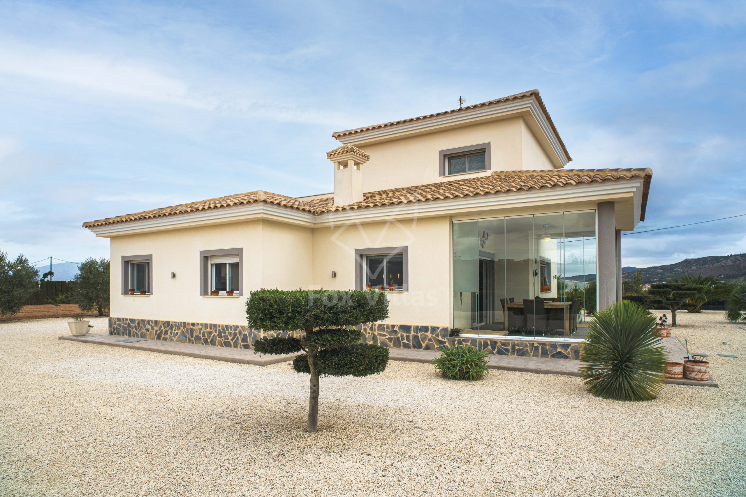 Moderne villa (2018) op 10.000 m² perceel nabij Pinoso. Vier slaapkamers, drie badkamers, open living met pelletkachel en airco, volledig ingerichte keuken. Bovenverdieping met eigen entree – perfect voor gasten. Verwarmd zwembad met zonnecollectoren, houten gazebo met barbecue, garage en zonnepanelen voor stroom en warm water. Slechts 1,5 km van het centrum.