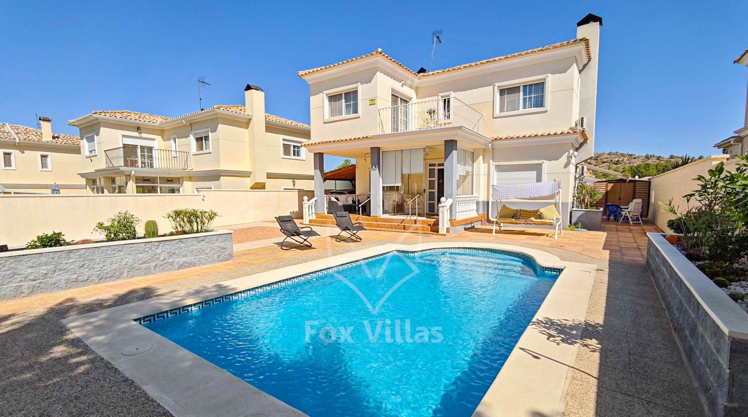 Vrijstaande villa in Aspe met 4 slaapkamers, 2 badkamers en extra gastentoilet. Ruime living, complete keuken, marmeren trap en terracottavloeren. Zuidgericht perceel (400 m²) met 8 x 4 m zwembad, buitendouche, terras en carport. Voorzien van airco, gascentrale verwarming, beveiligingssysteem en lage vaste lasten. Op loopafstand van voorzieningen en 25 minuten van luchthaven en stranden.